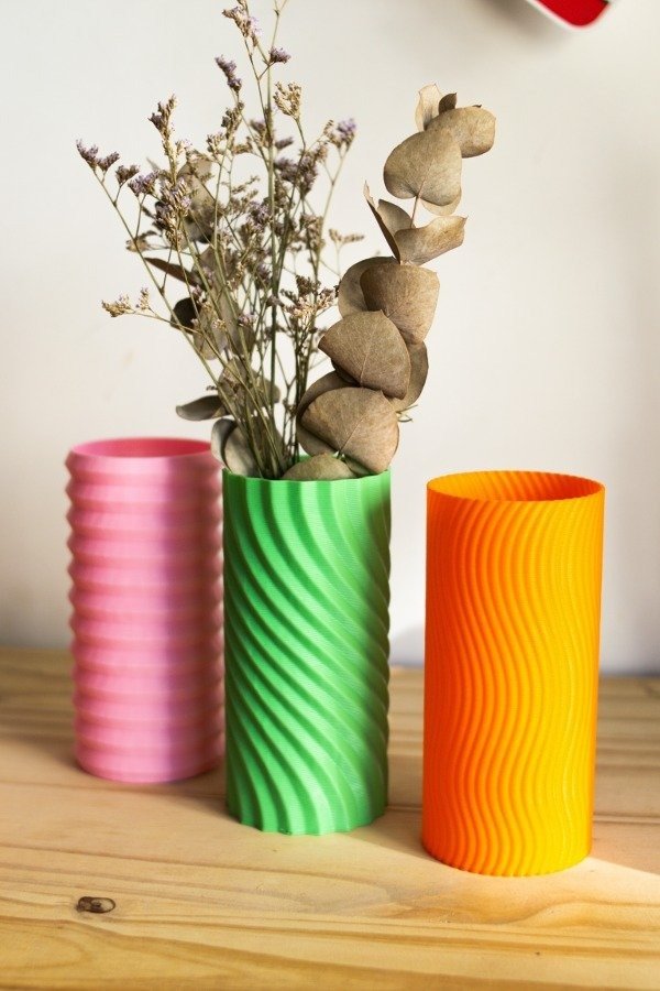 Floreros Impresos en 3D, el material es plástico y vienen con recipiente de vidrio 100% reciclado de botellas de vino.