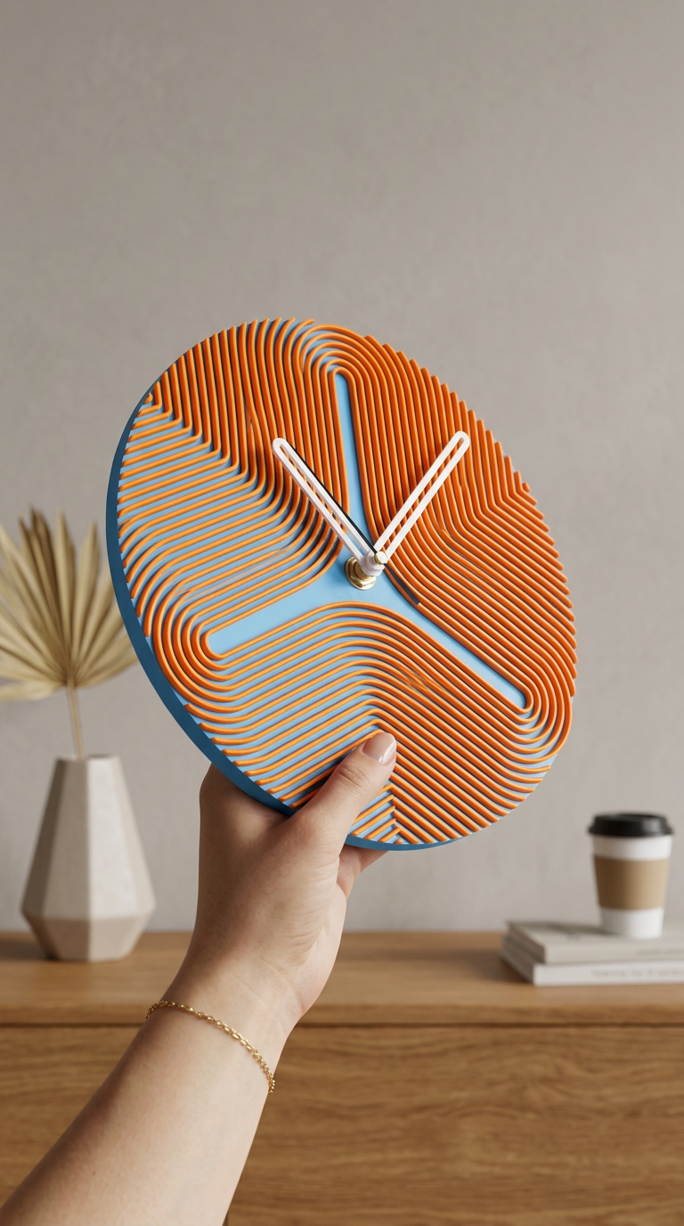 Su superficie con relieves ondulados genera un efecto visual dinámico que cambia según la luz y el ángulo desde el que lo mires. No es solo un reloj: es una obra decorativa que atrae miradas.